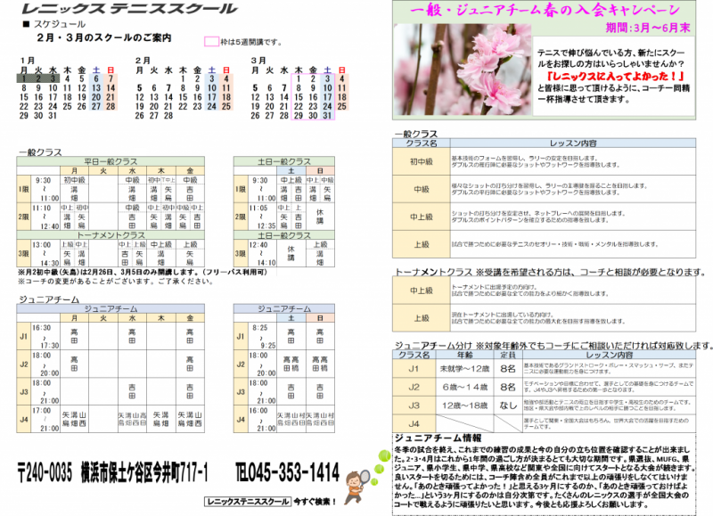 レニックステニススクール2-3月のスケジュール