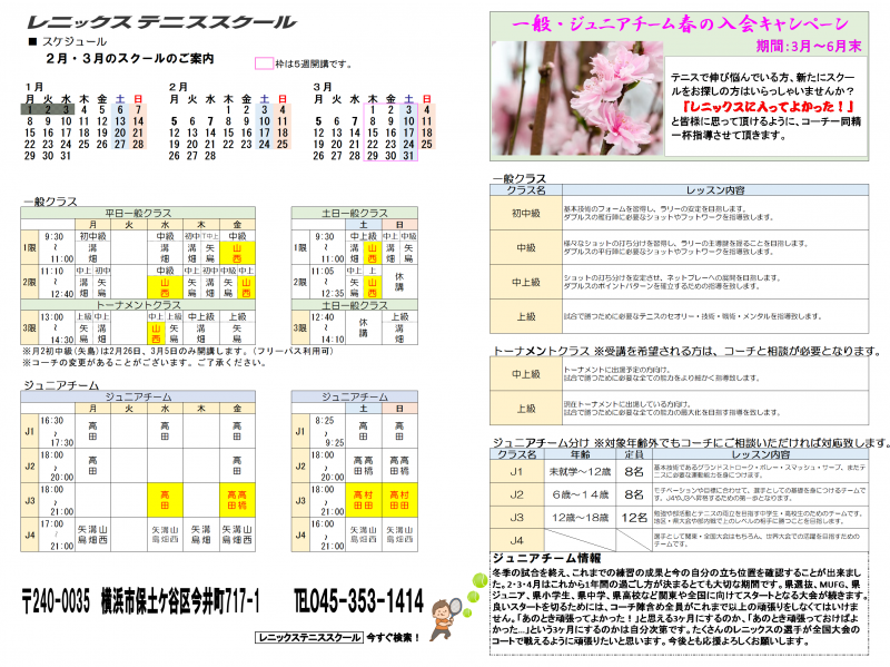 3・4月は担当コーチの入れ替わり等ご迷惑をおかけ致しますが、ご理解・ご協力のほどよろしくお願い致します。